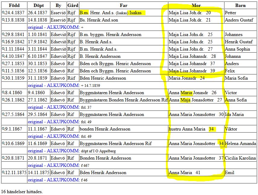 Snabbguide för de mest användbara länkarna:HISKI - Genealogiska Samfundet i FinlandHistorieböckernas uppgifter är inmatade i en databas som uttryckligen avsedd för sökning, ej för att ersätta de ursprungliga historieböckerna. - välj församling, ex. PEDERSÖRE -> tryck först på landskap (15) -> tryck på (Pedersöre) tryck på [Valda] - välj bok, ex. [Döpta] När är FELIX HENRIKSSON RIF född (25 år 1880) och vem är hans föräldrar ? Fyll först i så lite som möjligt. - skriv in på Barnets förnamn -> fel - skriv på by/gård-> ri (Rif stavas på många olika sätt. Rif är inte ett efternamn utan ett gårdsnamn) - skriv på Faderns förnamn -> hen (barnets patronymikon=faderns förnamn) (Per kan stavas på många sätt) - tryck på [Sök] Sök efter syskonen, fadern är bonde och byggmästare på RIF, HENRIC ANDERSSON och modern MAJA LISA JOHANSDOTTER 39 år. - backa genom att trycka på pilen uppe i vänstra hörnet eller tryck på knappen [Till sökblanketten] - tryck på [Töm] - barnets förnamn lämnas tom då syskonen har olika namn - skriv på by/gård-> ri - skriv in faderns förnamn -> hen - skriv in faderns patronymikon -> and - skriv först endast moderns förnamn -> ma - skriv inget på moderns patronymikont (patrynimikon namnet saknas ofta för modern) - tryck på [Sök] VIGDA Finlands släkthistoriska förening (FSHF) - Skannar in bl.a. kyrkböcker och domböcker. Sök i kommunionsboken i Pedersöre ca 1857 på Rif för att hitta om han har blivit änkling. - välj [Kyrkoböcker] om du inte är medlem och [Sökdatabas] om du är medlem - välj [Kyrkoböcker] från databasen Kyrkoarkiv - välj församling -> [Pedersöre] - välj [kommunionsbok] för åren 1856-1863 - välj bild [36.jpg] (om sidorna inte är indexerade blir man tvungen att bläddra igenom alla om man inte vet vilken gårdsnummer eller by Rif ligger i För en tydligare bild, sök även på Arkivverket digitala samling, se nedan för instruktioner. Här ser vi att första hustrun dött 1857 och andra hustrun kommer från Östensö. Sonen Petter flyttar till Sibbo år 1850. Anders Gustav dött eller flyttat före 1856. Johannes är nu Johan. Anna Sophia saknas, död eller flyttat? En son Leander född 1848 som inte kom fram i Hiski. VIGDA Arkivverket har flera miljoner inskannade dokument i Digitala arkivet - Välj [katalogträd] - eller skriv in i Fritt sökord: Pedersöre och tryck på [Sök] - tryck på [Pedersöre församlings arkiv] - tryck på [Huvud- och kommunionböcker] - tryck på [kaikki] för att se alla böcker som är tillgängliga - välj [Kommunionsbok 1856-1863 (I)] - välj bild [38] |