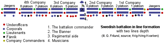 As a rule a Swedish battalion consisted of four companies (divided into eight platoons) and in battle these were deployed in line formation with two ranks depth, but during the marching, the army moved in column formation. If the number of the battalion was reduced to below 80 men, it was a rule to form three companies and six platoons instead of the original. In line, the front could be up to 170 metres long.
