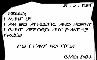 Översatt lyder texten ungefär: "Hejsan! Jag vill gå i säng med dig. Jag är så atletisk och har horn. Jag kan inte få upp den. Säkert! PS: Jag kan inte titta." Brevet