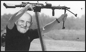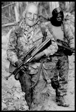 Här var jag med på en övning. Det gick ut på att vi skulle gå beväpnade ut i skogen i kamouflage kläder och skjuta på allt vi såg. Det var ganska roligt. Mannen som gick efter mig kallade vi till Lakrits-Peter, eftersom han alltid var så solbränd. Han kunde för övrigt kissa längst av alla på regementet.