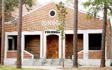När man äntrar byggnaden möts man av en tjugo meter hög staty av
