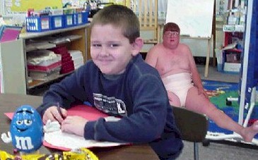 Här ser vi Håkan, skolans flitigaste elev, som håller på att skriva
