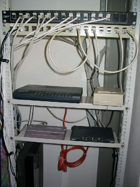 ISDN-reititin ja ISDN-pääte. Alahyllyllä hub ja ADSL-pääte.